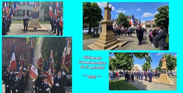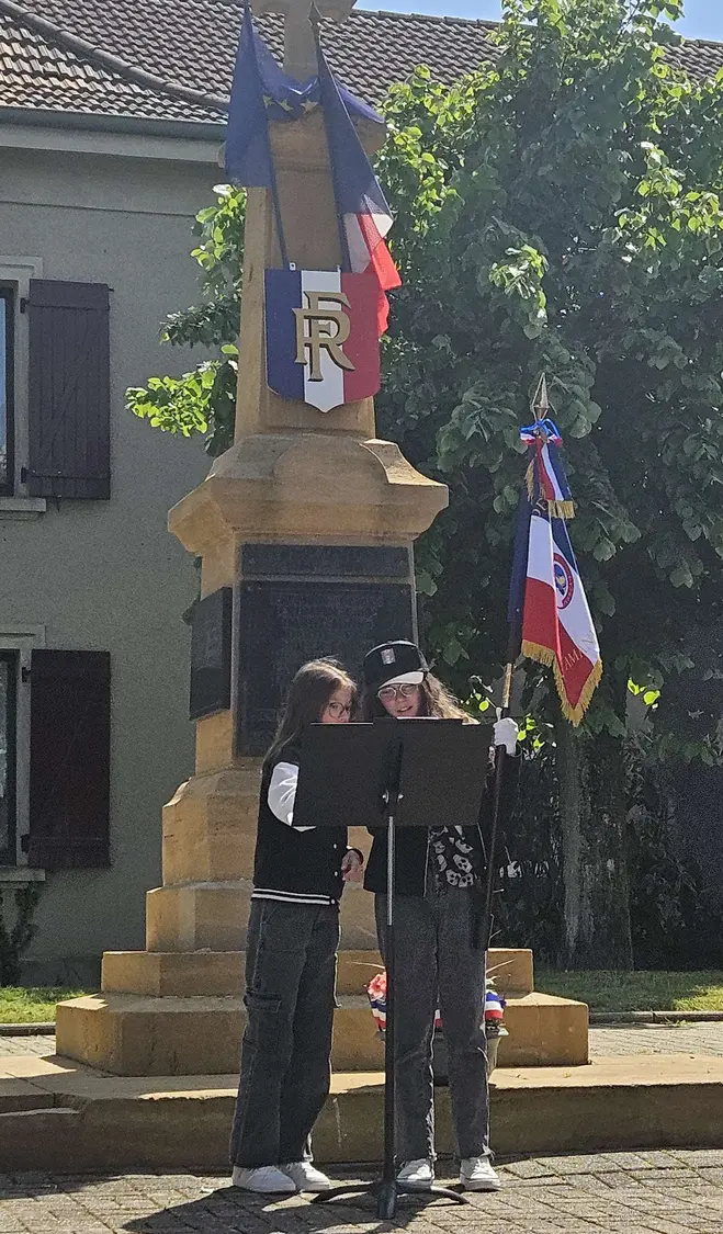 Cérémonie qui a eu lieu le 9 mai 2025 au Monument aux Morts en face de la Mairie, en présence d'élus, de porte-drapeaux, des classes de CM1/ CM2 et CM2 et d'un nombreux public.