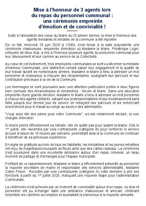Le mercredi 25 juin 2025, une cérémonie chaleureuse s'est tenue à la salle polyvalente, en présence d'élus et de l'ensemble du personnel.