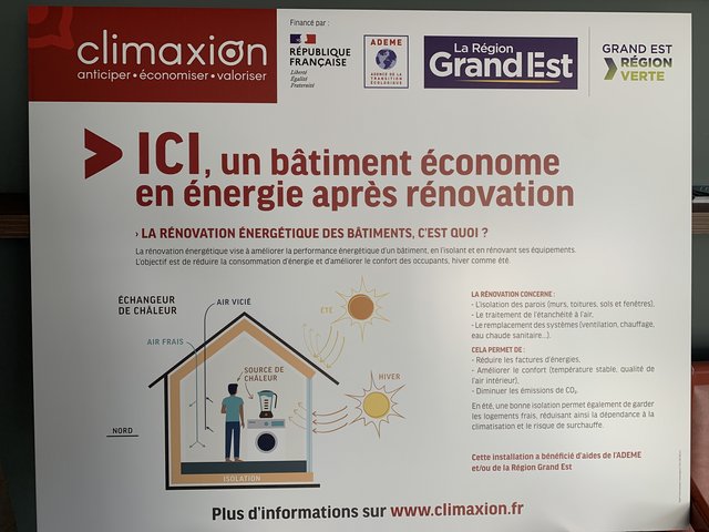 Ces bâtiments rénovés, pour être plus modernes, confortables et surtout moins énergivores, ont obtenu le LABEL « ICI, un bâtiment économe en énergie après rénovation » décerné par la Région Grand Est programme « CLIMAXION » (Efficacité énergétique et qualité de l’air)