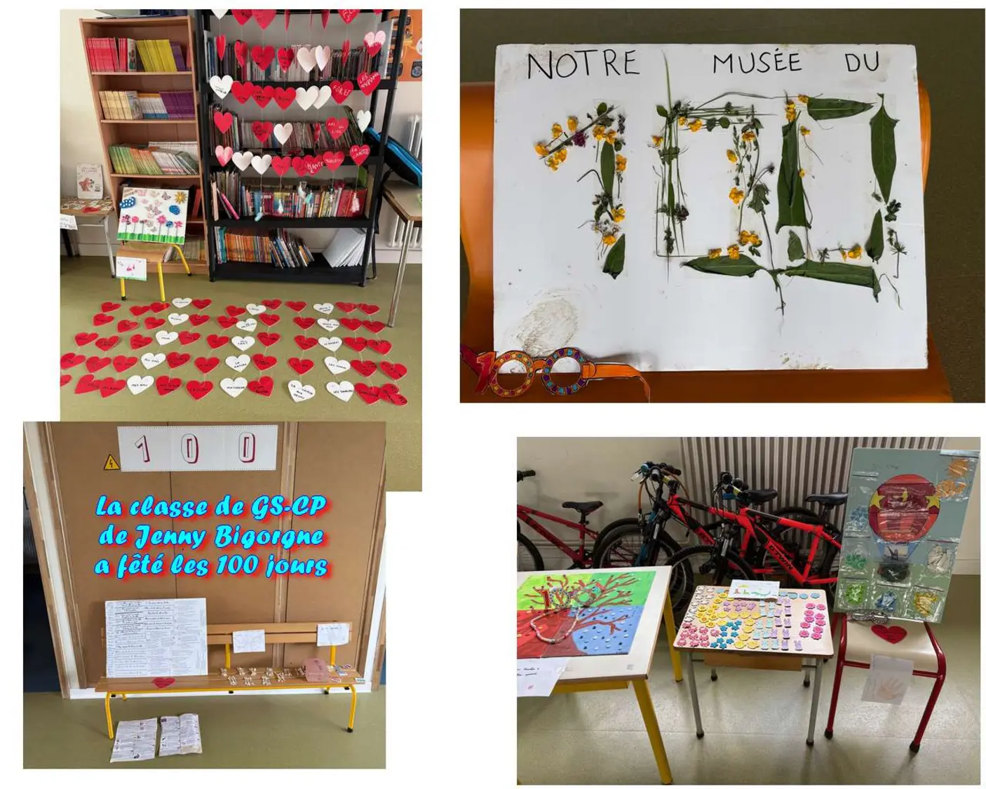 La classe de GS-CP de Jenny Bigorgne a fêté les 100 jours d'école à sa façon : les enfants ont confectionné des collections de 100 objets chez eux, ou les ont préparées à l'école, ou encore les ont réalisées pendant leur séance de "Classe Dehors" : on y trouve des arbres avec 100 boutons, 100 élastiques ou 100 grains de riz, des ciels avec 10 constellations de 10 étoiles, des colliers de 100 perles, des plantations de 100 graines différentes, une centaine de canards qui étaient cachés dans une maison, un zoo complet avec 100 animaux et même 100 choses qu'on aime et qu'on écrit sur des coeurs.