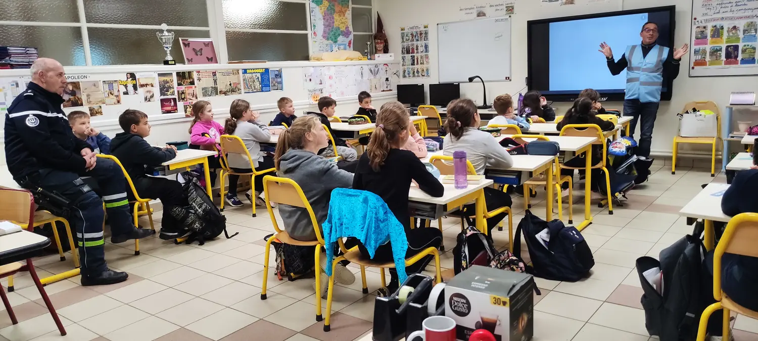 Ainsi le 12 novembre 2023, Monsieur Thierry PILLOT, intervenant du Pôle Sécurité routière de la préfecture de la Moselle, accompagné de représentants de la gendarmerie, en présence d'élus, a animé une séance de sensibilisation et de prévention aux dangers de la route auprès des élèves de deux classes de CM1 et CM2.