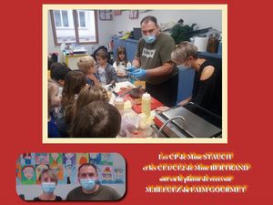Pour la semaine du goût, les CP de Mme STAUCH et les CE1/CE2 de Mme BERTRAND ont eu le plaisir de recevoir M.BLEUEZ du FAIM GOURMET et sa femme.