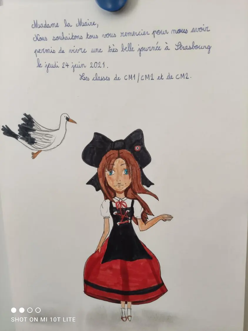 Au nom des deux classes, une élève de la classe de Monsieur Mourot a remercié Madame le Maire de leur avoir permis de passer une belle journée à Strasbourg, sortie exceptionnelle en compensation du séjour en classe de neige annulé en raison du COVID-19.Cette même élève a remis à Madame le Maire un magnifique dessin, souvenir de leur belle sortie. (Photo dessin)